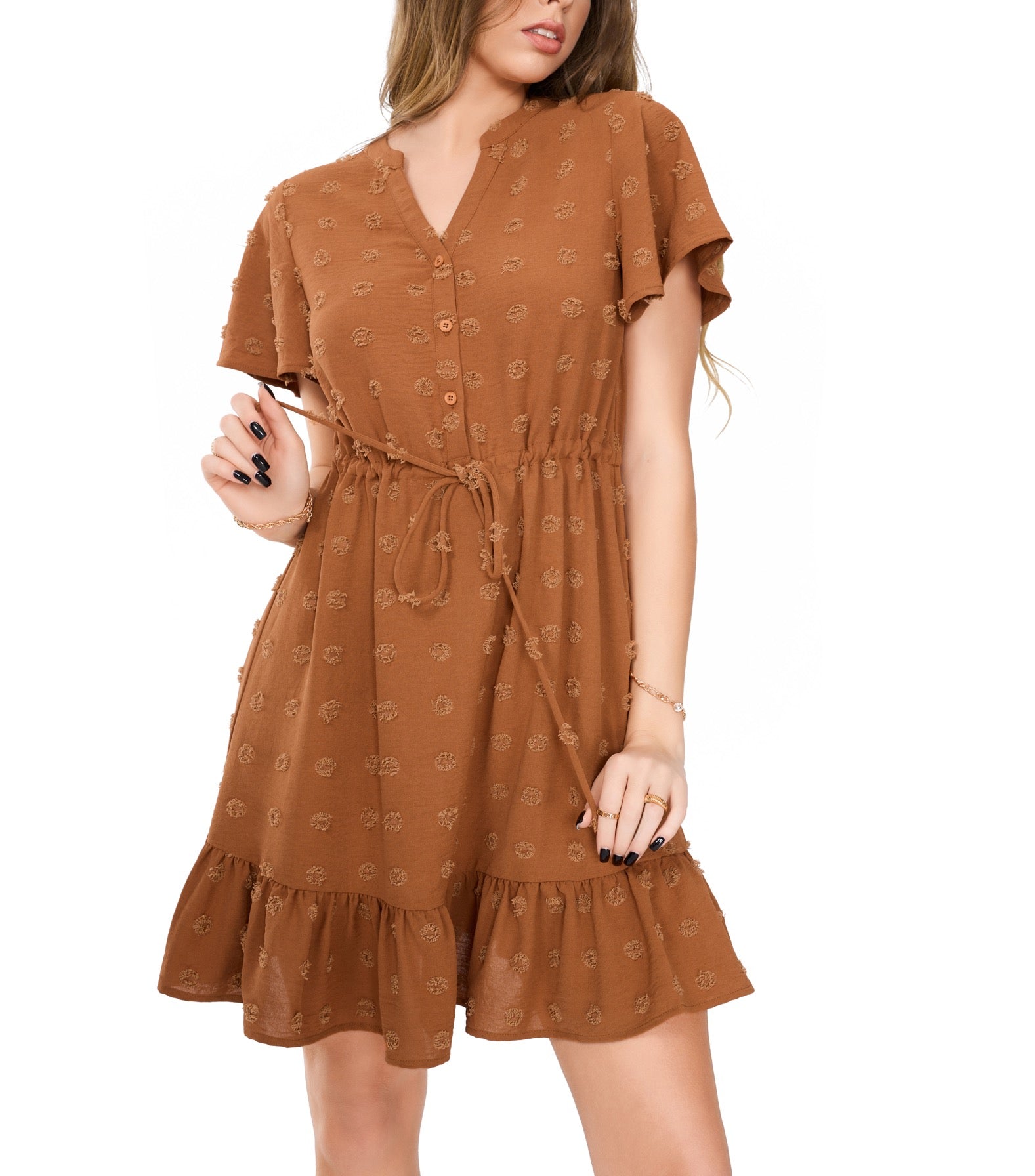 This Swiss dot short dresses for women comes with v neck, front button closure design, cute Swiss dots, short ruffle sleeve, high waist, knee length, flowy and swing ruffle hem to complete a flattering and slimming look.
